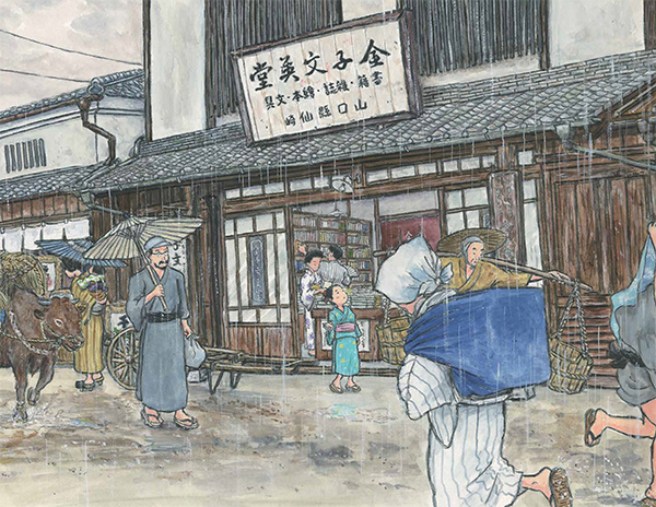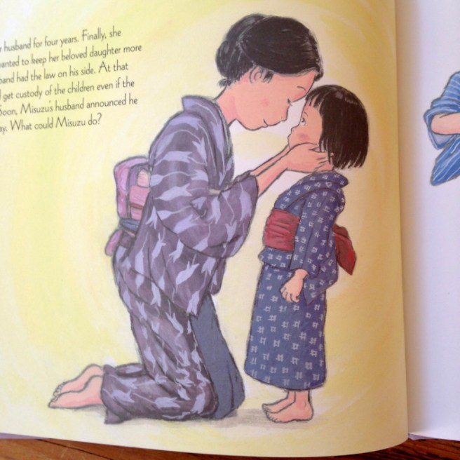 Toshikado Hajiri’s gorgeous paintings, rendered in subtle, muted tones, transport the reader to early 20th century Japan, with interesting details of life in Senzaki, the four seasons, and touching portraits of mother and child that tug at the heartstrings. I especially love the illustration of little Misuzu standing in front of the family bookstore looking up at the falling rain.