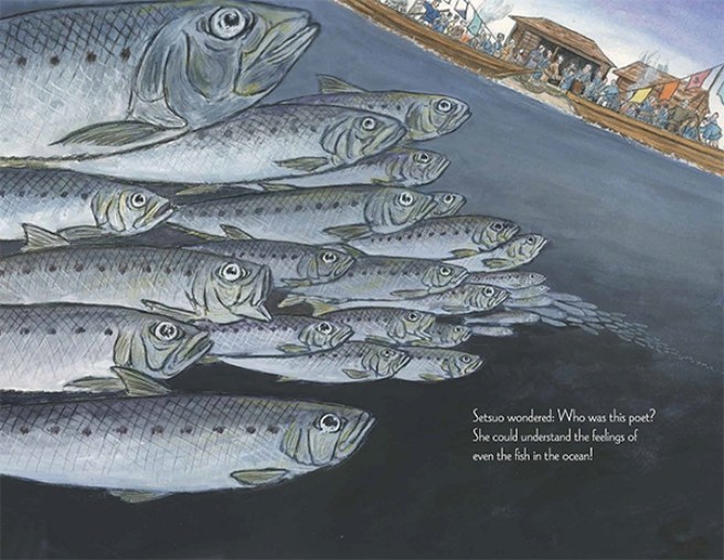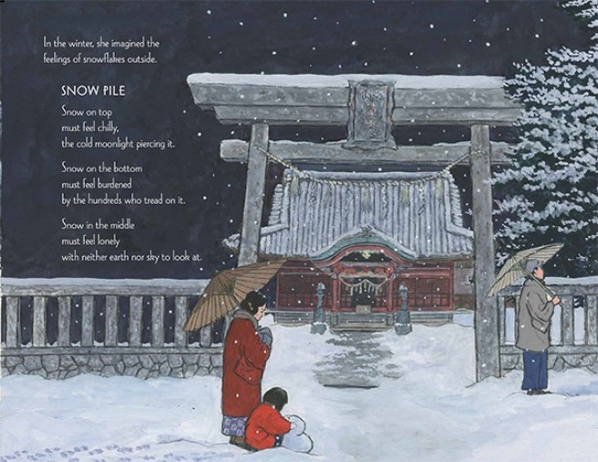 Misuzu’s story is a tragic one, but readers will be inspired by her love of reading and writing poems, her unique way of looking at the world, and the joy she took in so many things. The creators have duly honored Misuzu’s life and work with thorough research, lyrical writing, adept translation, and stunning illustration. Also notable: this is the only children’s poetry book I know of that features Japanese poems in translation that are not haiku.