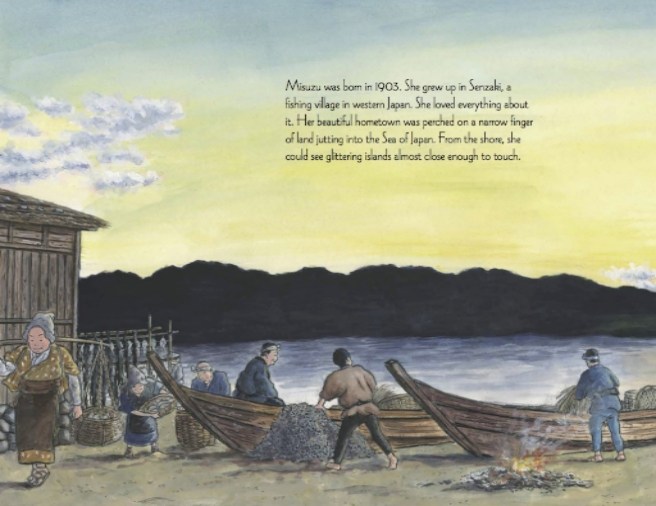 Thanks to this breathtakingly beautiful picture book, a new audience of North American children can now read a selection of Misuzu’s poetry in English, learn about her short tragic life and the fascinating backstory of how her work was lost for half a century before being rediscovered in 1982.
