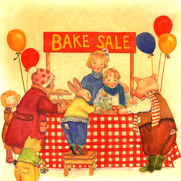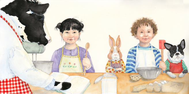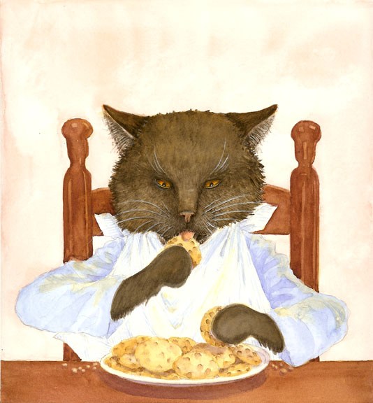 Amy’s manuscript seemed open to a variety of interpretations for illustrations. My favorite subjects are children and dressed animals co-existing in their own world. As a child, I spent much of my time dressing up my cat and dog, along with my dolls, and imagining the world they inhabited. So it was very clear to me just how I would depict the scenes in the COOKIES books.