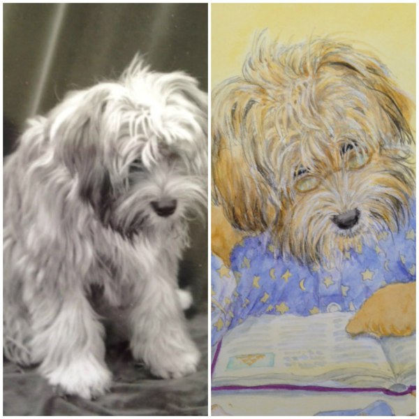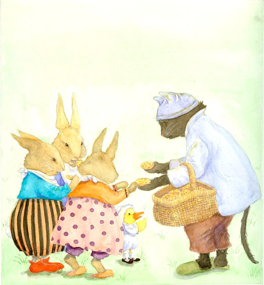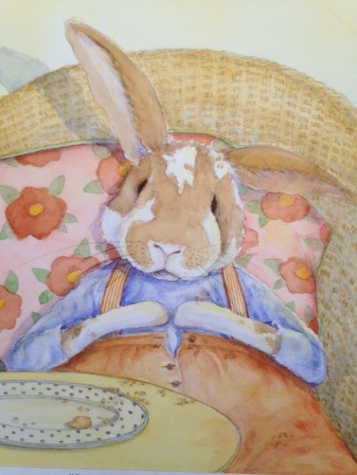 While the first book is my favorite, I do love all four. I have many paintings that I like, but some that come to mind are those that I modeled after animals I knew. In the first book, “REGRET” is based on a photo of a rabbit that belonged to my neighbor Jeanne Birdsall (author of THE PENDERWICKS). In the picture, there is an empty plate of cookies, just crumbs left, and the rabbit has the top button of his pants unbuttoned. “WISE” is my dog surrounded by some of my favorite childhood books.