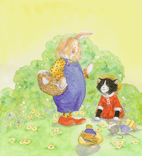 I want to inhabit her cozy interiors with their wainscoted walls, polka dot curtains and checked tablecloths, and befriend the adorable dogs, cats, bunnies and sheep dressed in human clothing.