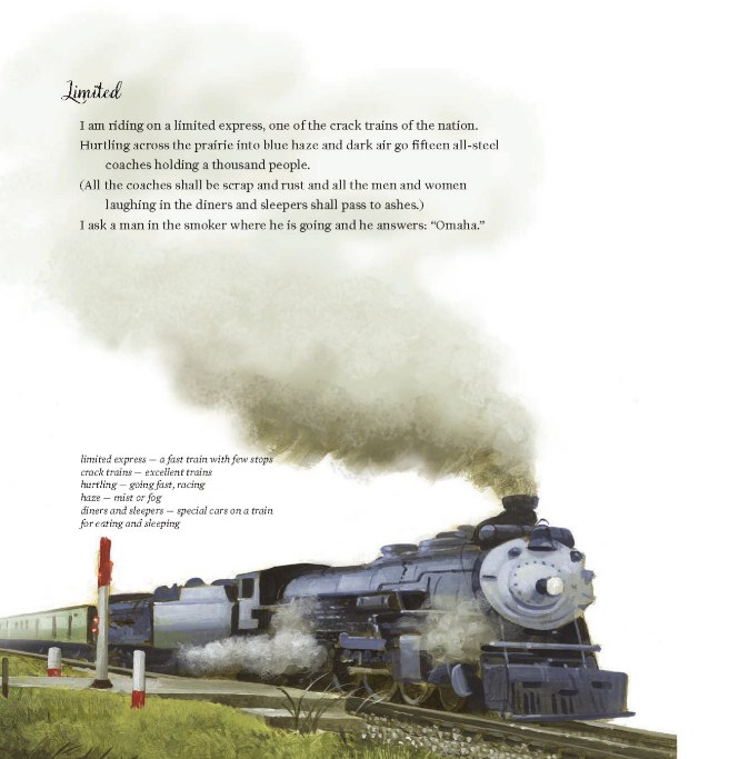While I was disappointed that Sandburg’s iconic “Chicago” was not included (perhaps deemed too visceral for the target audience?), we do get big city glimpses from “Smoke and Steel” and the “The Skyscraper Loves the Night” (“One by one the lights of a skyscraper fling their checkering cross work on the velvet gown of night”).