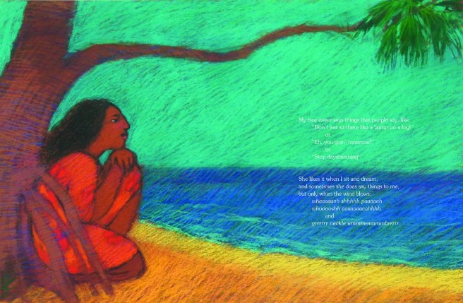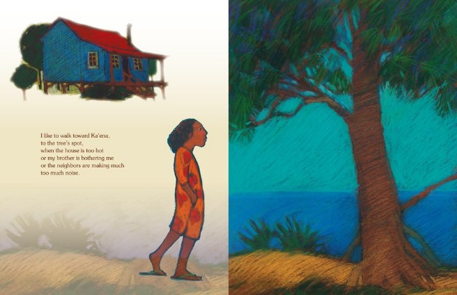 I like how the tree is a threshold, on the meeting point of land and sand, as the role of the tree is, where the imagination meets reality. We all need a spot there, to easily access one state or the other. The art is gorgeous, the pastel colors really invoke Hawai’i.