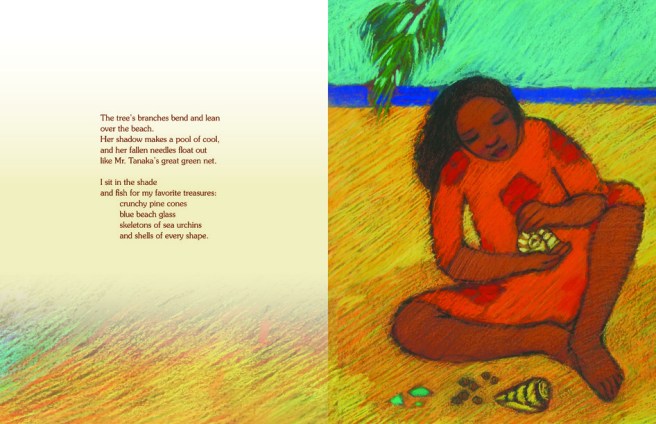 I had a special tree at my grandparents’ home, stayed in it reading and daydreaming so many times. I’ve returned to that little town to see if it was still there, and it is, but it’s now older of course, and enormous! I love seeing the different connections that those of us on the mainland would not make, Jama, but of course you would, like “Lightning cracks the sky open like a coconut.” and “like Mr. Tanaka’s great green net.” Thank you for sharing all about this new book!