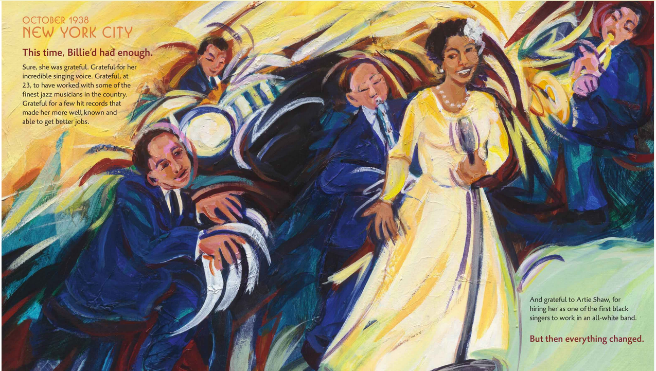 Golio’s narrative begins when Billie is 23, an established singer with hit records and club appearances, who’d worked with “some of the finest jazz musicians in the country.” She was even singing with Artie Shaw, “as one of the first black singers to work in an all-white band.”