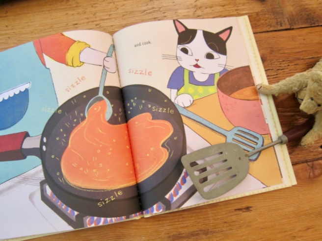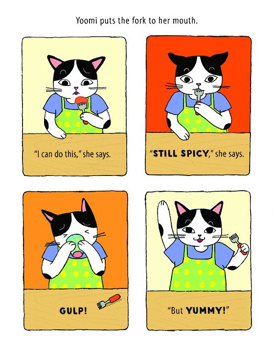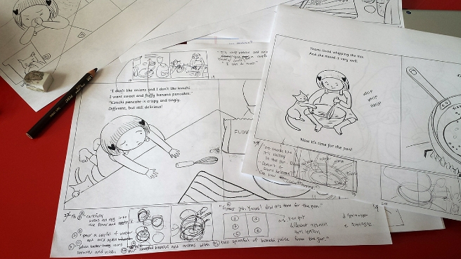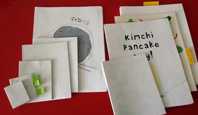 3. This book is adorable and I loved learning all about Aram Kim’s process in creating it. So interesting to see her original sketches and how Yoomi went from a human character to a cat. I’m impressed with how many dummies and variations she works through, as well. Thanks for sharing this, Jama, and for the recipe. I don’t think I’ve ever tried kimchi, but these pancakes looks delicious!