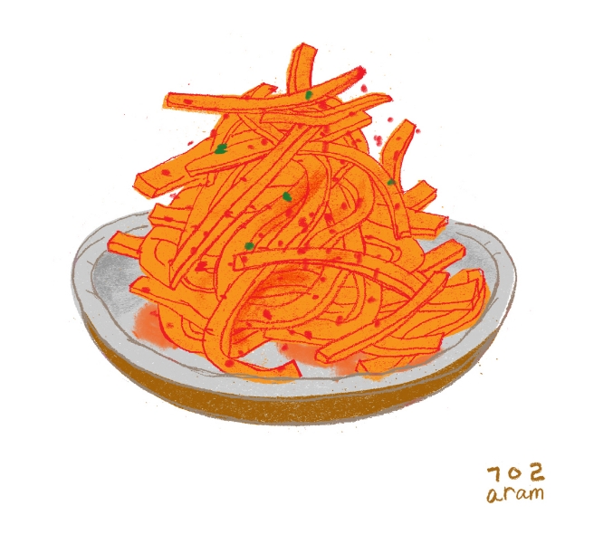 It’s pretty similar to kkakduki, which is also made of daikon radish, but while kkakduki is cut into square shapes, muchae is in long, chopped shapes. Crunchy, refreshing, and so delicious! My mom always makes this fresh whenever I go back home to South Korea, and she makes sure it doesn’t run out while I’m there.