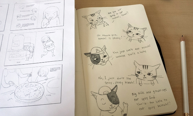 The best part of creating this book was that I felt very at home. There were many parts that I could deeply relate to, loving to eat, not wanting to eat kimchi as a kid, wanting to prove myself as a big kid (I’m the youngest of two), a strong bond with grandma, etc. Also I really love drawing food. I have a blog where I only draw food. So having drawn all this familiar Korean food in a fun story was certainly a blast. Also the expectation that I could be introducing a bit of Korean culture to a wide audience excited me very much.