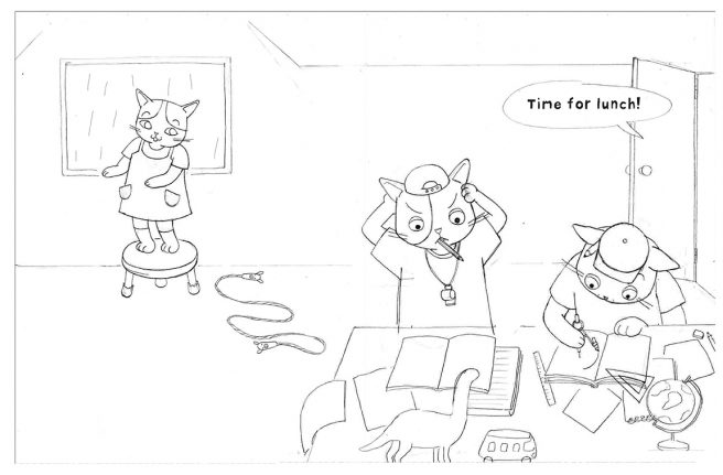I do like drawing animals — a LOT. But I like drawing people, too, so it’s hard to say I prefer one to another. The cat character in the second book was not originally planned. Yoomi was a human girl. But when the book was sold to Holiday House, I was doing some character studies and sent those to my editor asking for her opinion. One of those characters was a cat. It actually wasn’t just for fun. I had an internal debate going on about what the characters should look like.