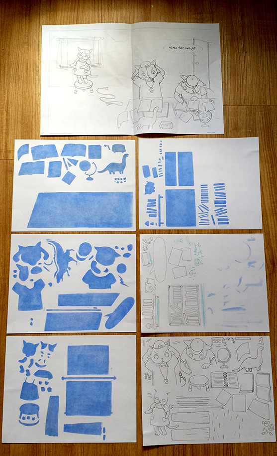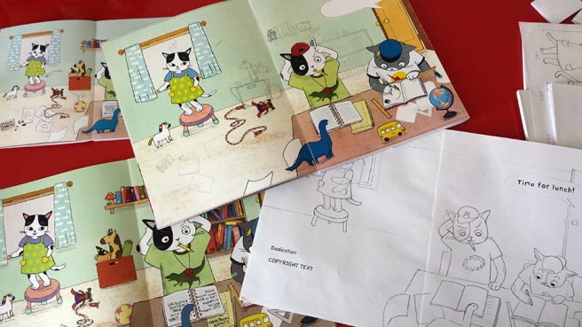 When I finish coloring the entire book, I make a trip to the store where they print in color. I print the entire book and make them into a dummy. That way, I can see what I didn’t see on the computer screen and also I can check the page turn. I add details, spot the inconsistency, revise art, and make notes. I repeat this process until I am happy with the final art. Over the process, I end up making lots of dummies, in various sizes.