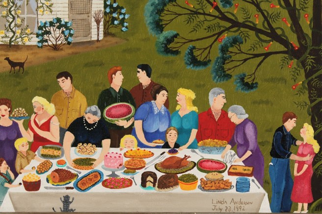 Great picnic art! I grew up in L.A. and we had picnics on the beach, where sand was often on the menu, giving a whole new meaning to the word “sandwich.” Sandwiches, potato chips, and grape soda—those seem like picnic food in my somewhat foggy memories of childhood. And my mom always brought apples or grapes, which were (and still are) her definition of dessert.