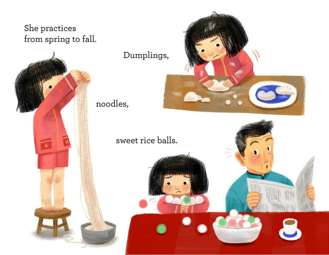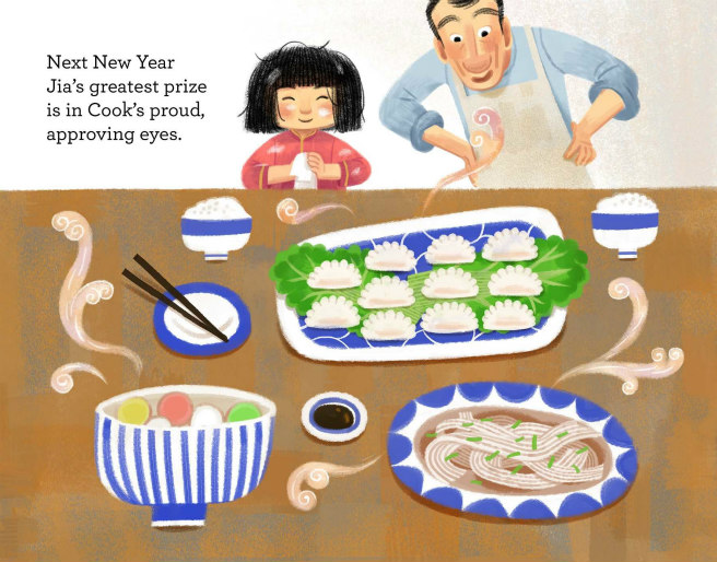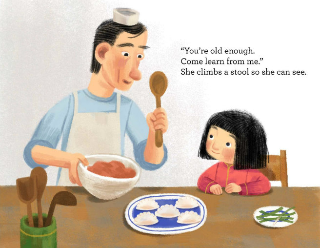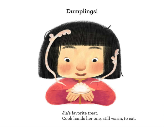 Cook offers to teach Jia how to make her own dumplings. But no matter how hard she tries, hers don’t look anything like his.
