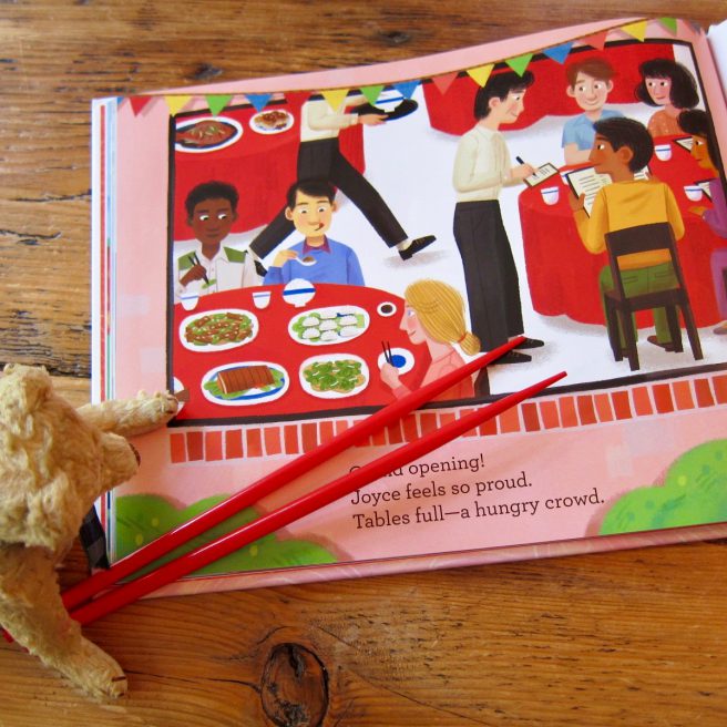Katy Wu’s vibrant, emotive illustrations pull the reader right into the action. Defty drawn facial expressions capture moments of frustration, surprise, dismay, pride, worry and contentment. Wu uses the color red (a symbol of happiness and good fortune in Chinese culture) to great effect: Joyce wears red for most of the story, and there are striking red tablecloths, working surfaces, lanterns, and restaurant doors.