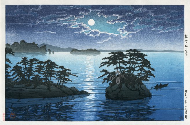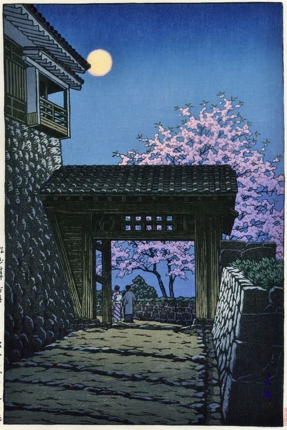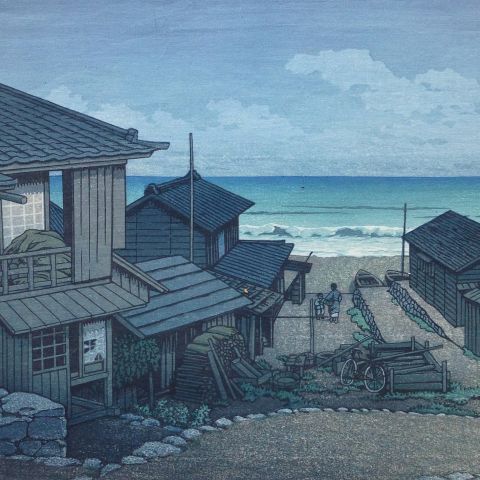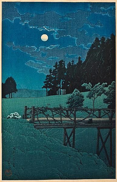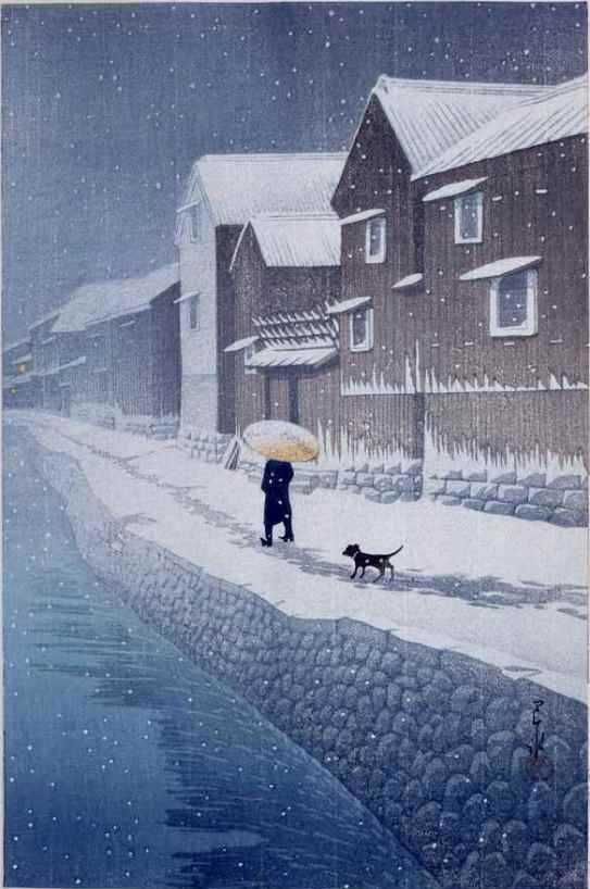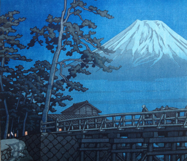 Born in Tokyo, he studied both Japanese and European painting techniques and is known as the “Master of Snow.” He liked to travel around Japan, sketching and making watercolors of scenic landscapes and townscapes, upon which he based his prints. The shin-hanga movement focused on traditional themes (landscapes, famous places, beautiful women, birds and flowers) but incorporated Western elements (effects of light, expression of moods).