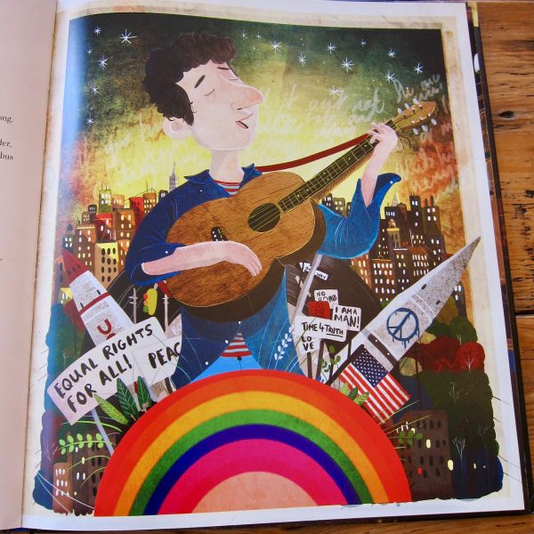 And of course, I love Litchfield’s caricature of Dylan and his acoustic guitar, surrounded by signs and symbols of the sixties. 🙂