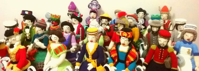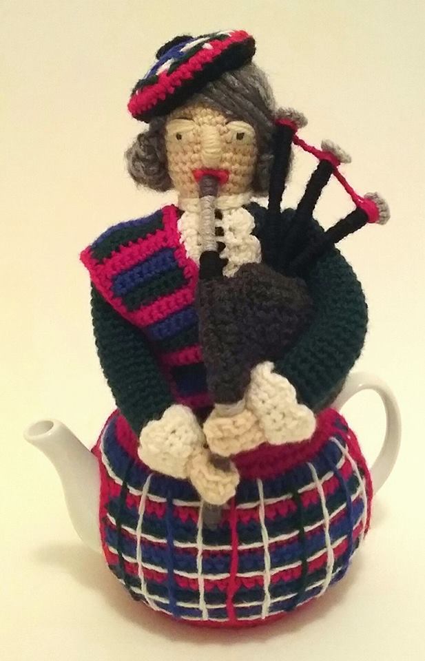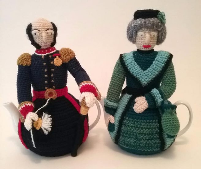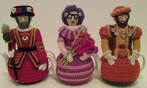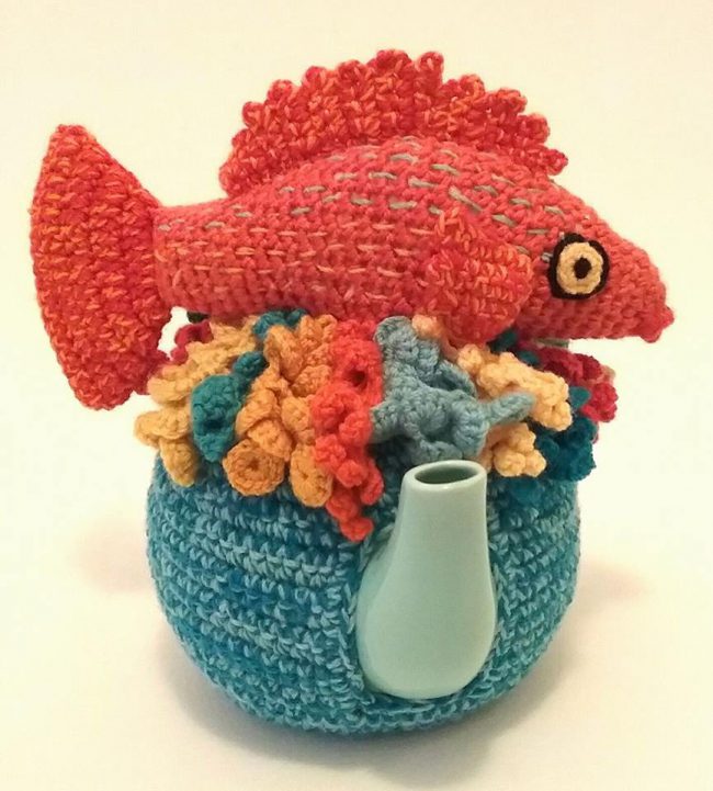 For his tea cosies, he’ll first crochet a traditional cover for the base, then build a 3D form out of foam or wire for whatever animal, person or object he wants to add, and then crochet a cover for it. Finally, he’ll crochet any other loose accessories or finishing details to sew on later.