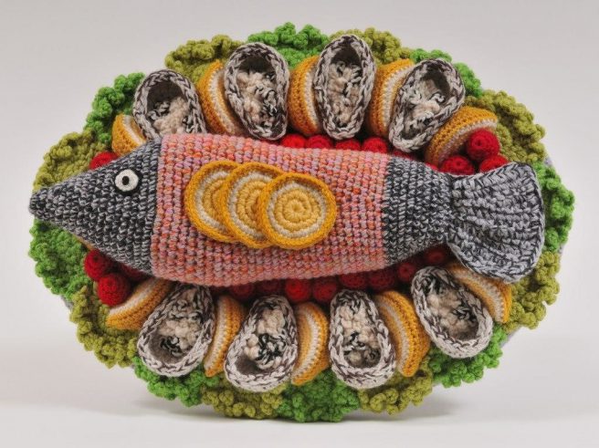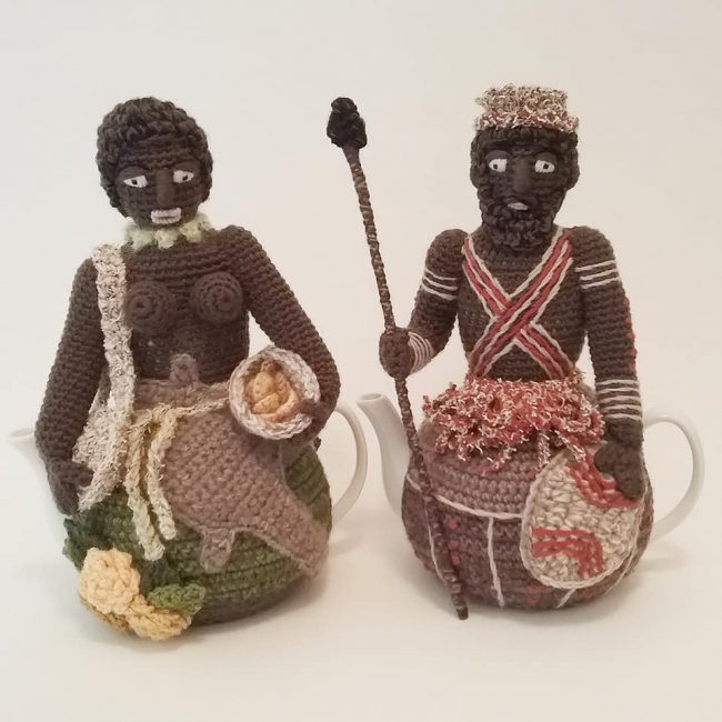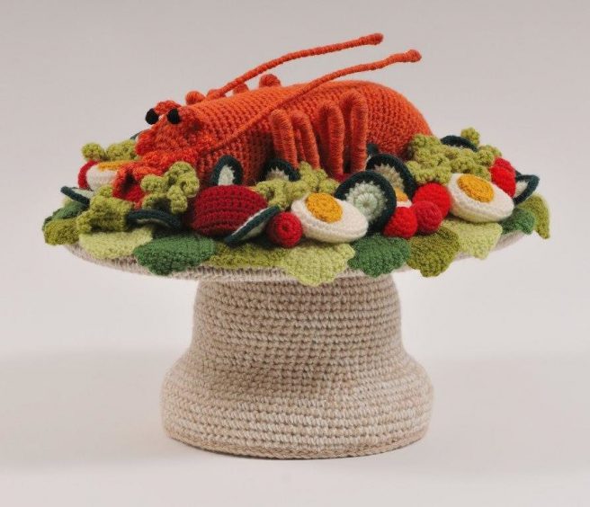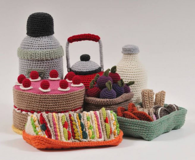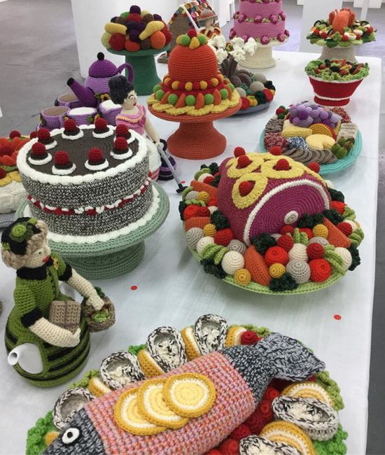 For his food creations, he takes his inspiration from old cookbook photos or magazine ads from the 50s, 60s and 70s. A council worker by day, he crochets on his living room couch at night while watching old Australian films and TV series. He says he’s always been into “nostalgia, stories, moments in time, people in the news.”