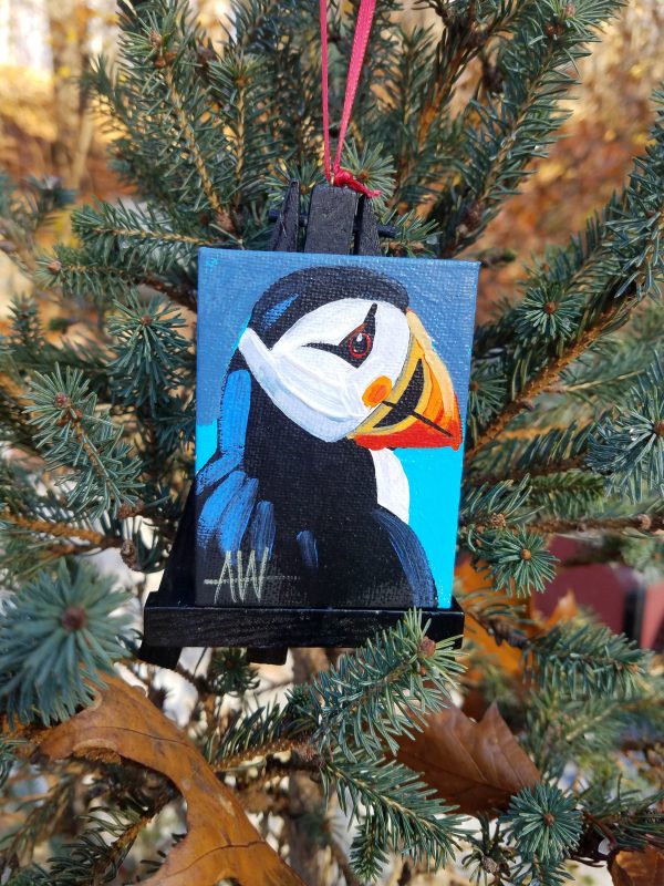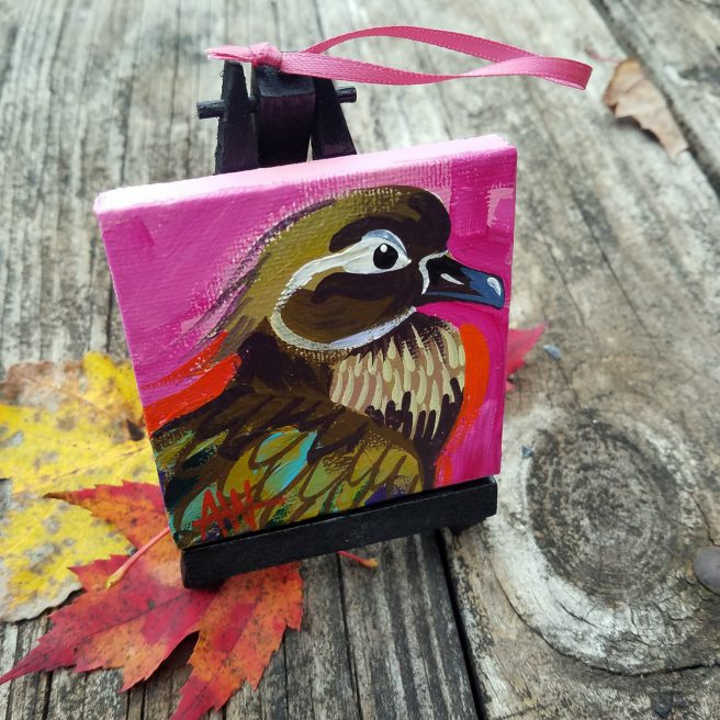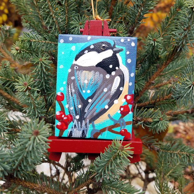 Each of these is a one-of-kind work of art. Ashley paints the birds with acrylic gouache on mini canvases, then mounts them with removable glue dots on painted easels. There’s a tiny screw eye and ribbon for hanging on your tree or in a window, or remove the ribbon and set it on a table or shelf.