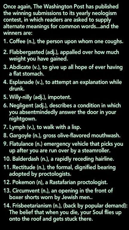 8. Comic Relief Time!! Just in case you haven’t seen this list of neologisms, thought I’d share it here cause we all need to laugh — now more than ever.