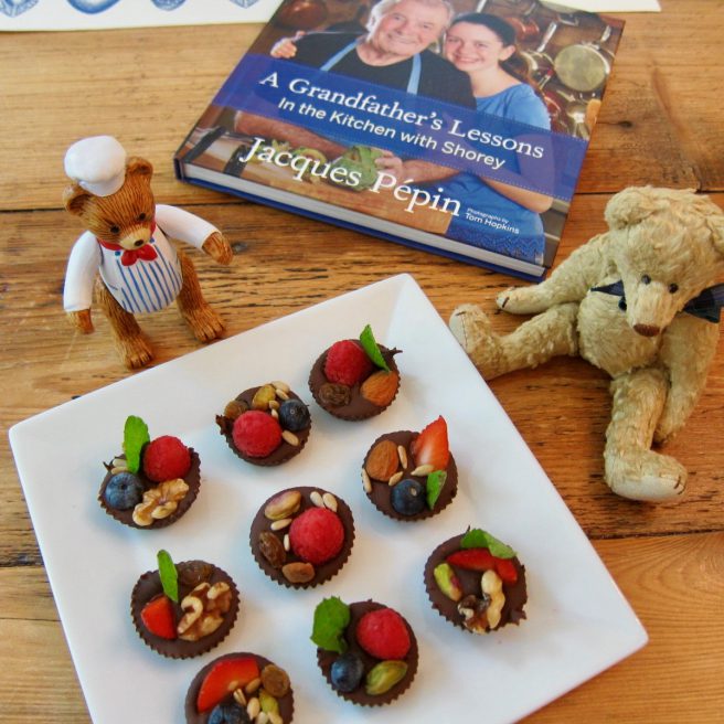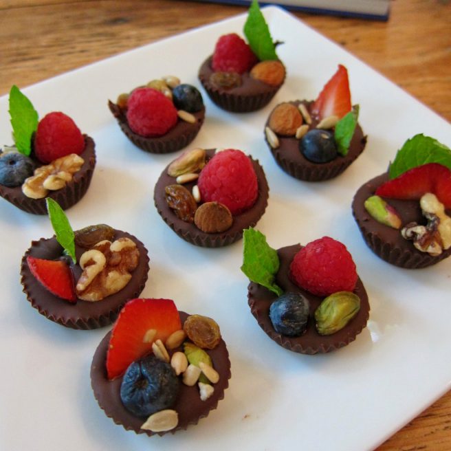 You simply melt bittersweet chocolate, divide it among a dozen mini paper baking cups, then arrange whatever fruit and nuts you prefer on top. We used blueberries, strawberries, raspberries, walnuts, almonds, pistachio nuts, sunflower seeds, golden raisins and a few mint leaves for color. These are then chilled for about an hour before you peel off the paper cups before serving. You can use dark chocolate, as we did here, but milk or even white chocolate is fine too. The small paper baking cups are about 1″ in diameter on the bottom, and 2″ across the top.