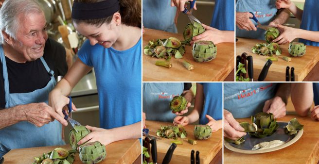 I highly recommend watching some of the companion videos, which were filmed in Jacques’s home kitchen in Connecticut. The interaction between the two is endearing and Jacques is a patient and thorough teacher. Lots of practical knowledge is conveyed without fuss and a nice dash of humor. Ever wonder what to do with leftover bread? How do you trim an artichoke or pipe meringue?