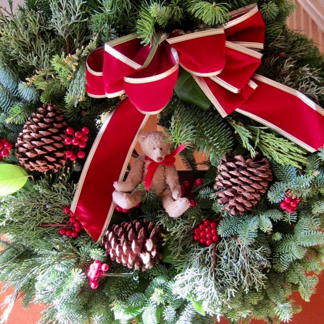 W is for Wreaths hung up on the wall.
