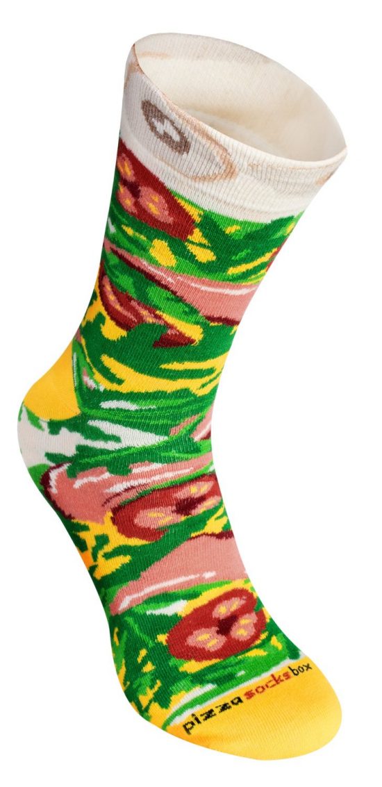 PIZZA SOCKS are unique socks created from high-quality products confirmed by Oeko tex certificate. Hand kneaded combed cotton, baked with fresh ingredients in our oven guarantees that your legs will luxuriate every time you wear them. Thanks to their natural components of the floral origin, skin can freely breathe and be protected at the same time from cold and overheating. On the other hand delicate ribbing and a flat stitch Rosso makes socks more enjoyable and comfortable. PIZZA SOCKS not only entertain by its rich flavor but also by its super original look. Interesting setup of ingredients on each pizza will definitely not make your shoes look boring.