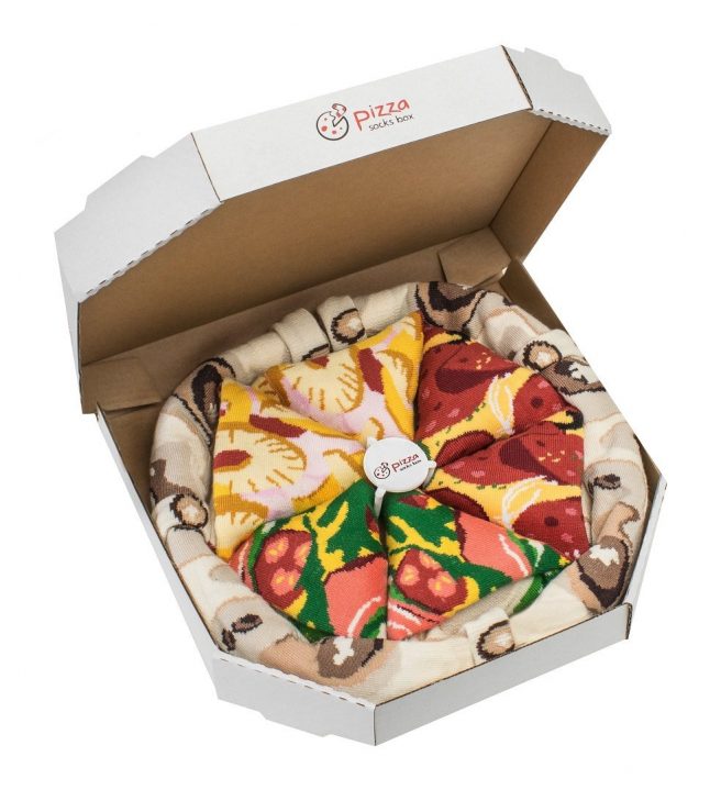 Made by a small family business in Central Europe, these come 4 pairs per box in different flavors: Pepperoni, Italian, Hawaiian, Capriciosa, and Vegetarian. There’s also a pair of plain dough socks in each box. You can get all one flavor or a mixed box, or buy just one pair in an individual slice box.