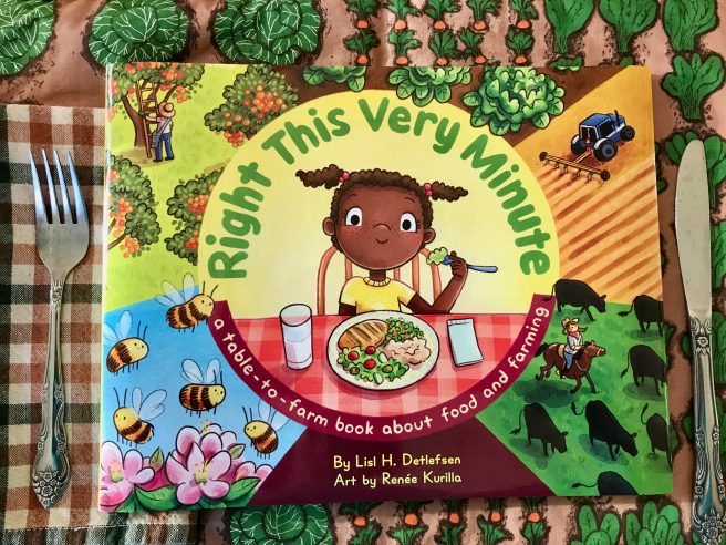 This time she’s teamed up with Boston-based illustrator Renée Kurilla to serve up Right This Very Minute: A Table-to-Farm Book About Food and Farming (Feeding Minds Press, 2019).