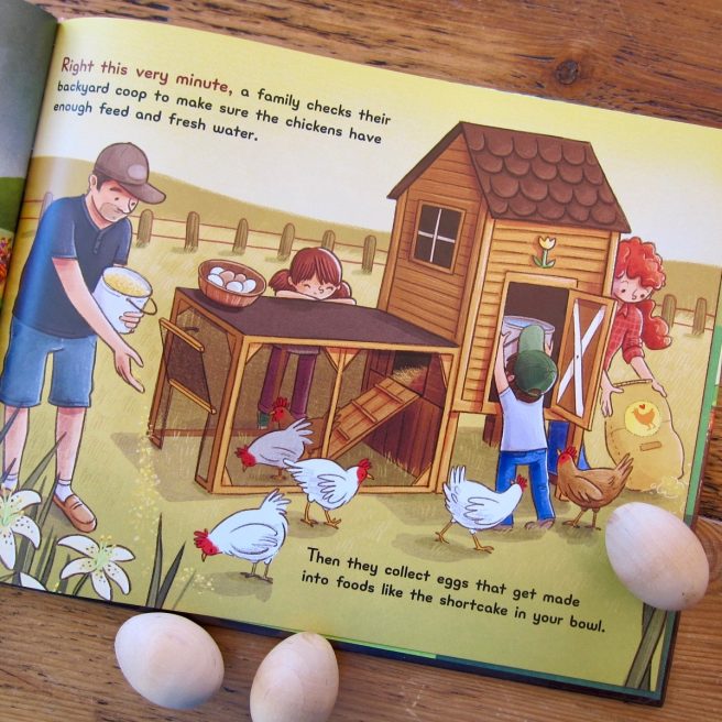 ♥️ Check out the publisher’s website for lots of cool supplementary resources, including short videos featuring real-life farmers describing what they’re doing “right this very minute,” a Free Lesson Plan, an Educator Guide, as well as additional videos with relevant info (cranberry farming, crop rotation, egg production, etc.)