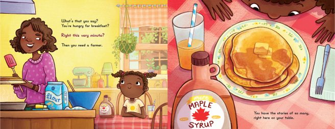 She then goes on to explain that the oranges are tested for ripeness at the citrus grove before they’re harvested and squeezed into juice. Meanwhile, a farmer is preparing his field for seeding. The wheat will be “grown, harvested, and then ground into flour” for pancakes. At the same time, a sugarmaker installs a new tubing system to carry maple sap to a storage tank before it’s boiled down into thick maple syrup in evaporators.