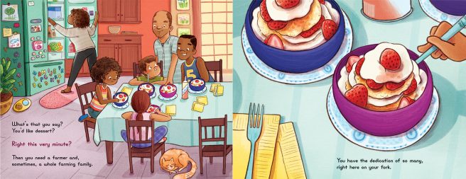 She’s populated the spreads with a friendly, diverse group of kids and grown-ups busy working and eating together, with great close-ups of each featured meal. Who can resist that big stack of pancakes with syrup dripping down the sides, or those mouthwatering servings of strawberry shortcake?