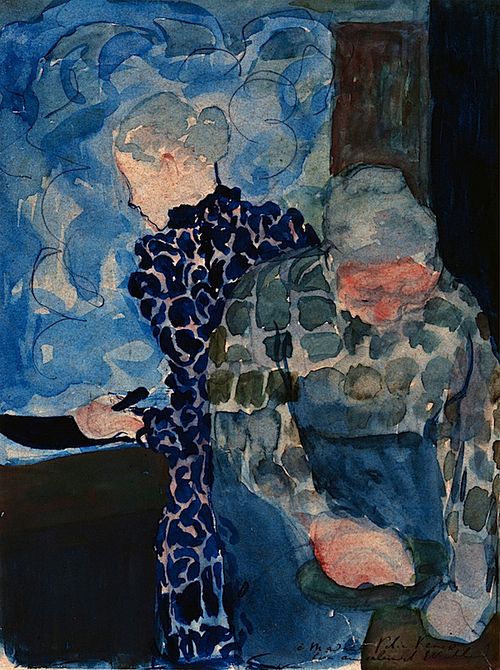 I agree with William Gass that blue is most suitable as the color of interior life. Picasso comes to mind, with his famous Blue Period. He was going through a profound depression after the suicide of his friend, but just as Mucha suggests about the nature of despondency, he was eventually able to move past his dark mood in a few years.