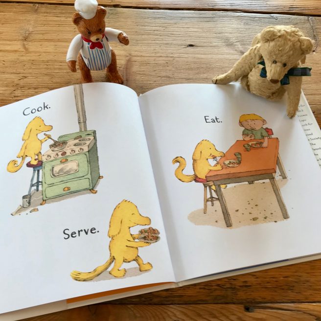 Cute and adorable doesn’t begin to describe this book. A heartwarming story of a boy and his dog brilliantly told with the sparest of texts — basically just one word for each spread. But the pictures! There’s just something about that dog. He follows commands and is the best companion. He does things ordinary dogs don’t usually do, like bow, juggle, cook, serve and clean! Then he and his boy have some adventures, sailing the high seas and building their own rocket ship to fly to the moon.