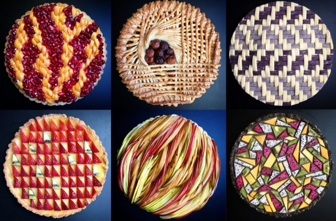 Now, we’ve seen many talented pie artists out there, who create beautiful crust designs using cookie cutter leaves, flowers, hearts, etc. Lauren’s pies are all about mathematical precision. She loves geometric patterns and textiles, creating her intricate designs with lattices and cut fruit.