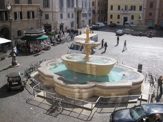 Andrea: “A Rome Morning” celebrates the gorgeous Piazza Farnese, near the Pantheon. A small piazza that is maybe not as well-known as some of the others; it was home to us on the two trips we took to Rome. We stayed in the beautiful monastery, the Casa di Santa Brigida, which overlooks the piazza and the cafe where I so happily dwelled in this poem.