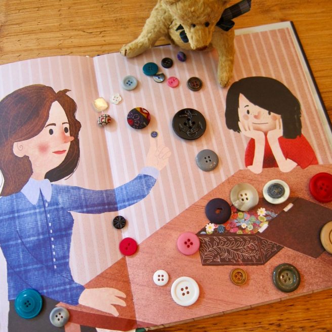 Her mom has a great box full of buttons: “shiny ones/of shell and glass./Pearly circles,/swirls of brass.” Such a wonderful variety that it’s impossible to choose a favorite.