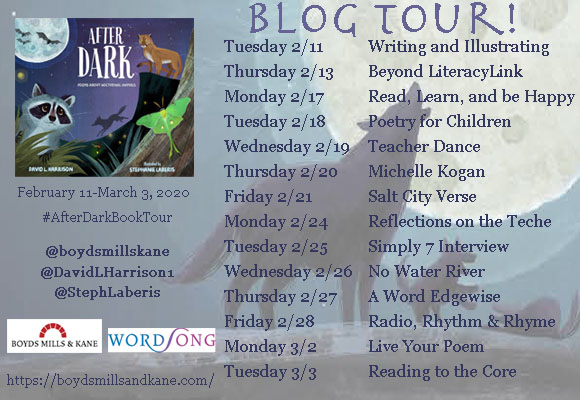 9.  Another New Book Alert: Look for After Dark: Poems About Nocturnal Animals by David L. Harrison and Stephanie Laberis (Wordsong, 2020), officially hitting shelves on February 25: