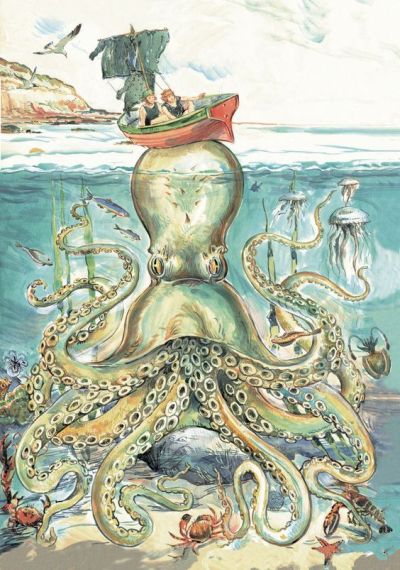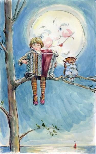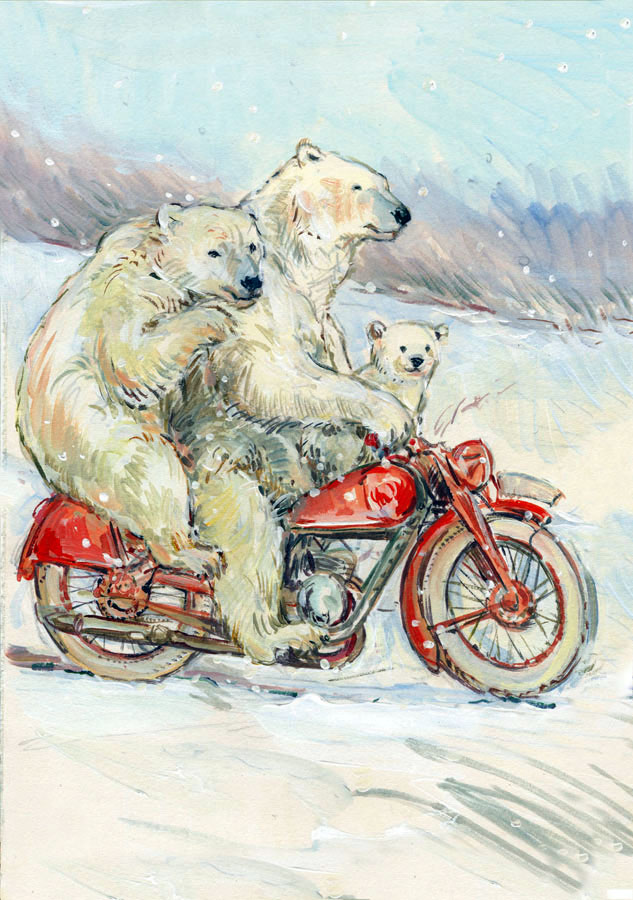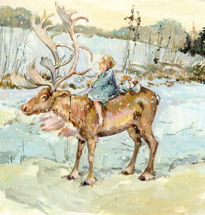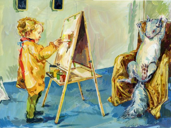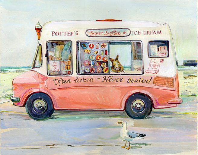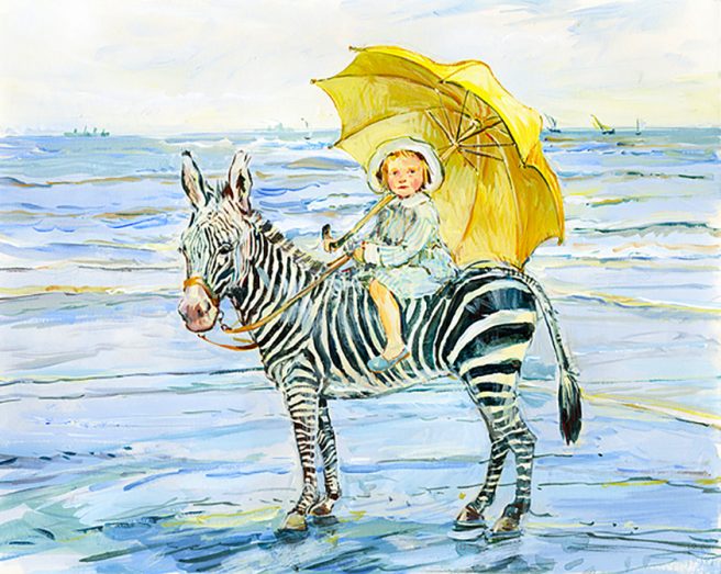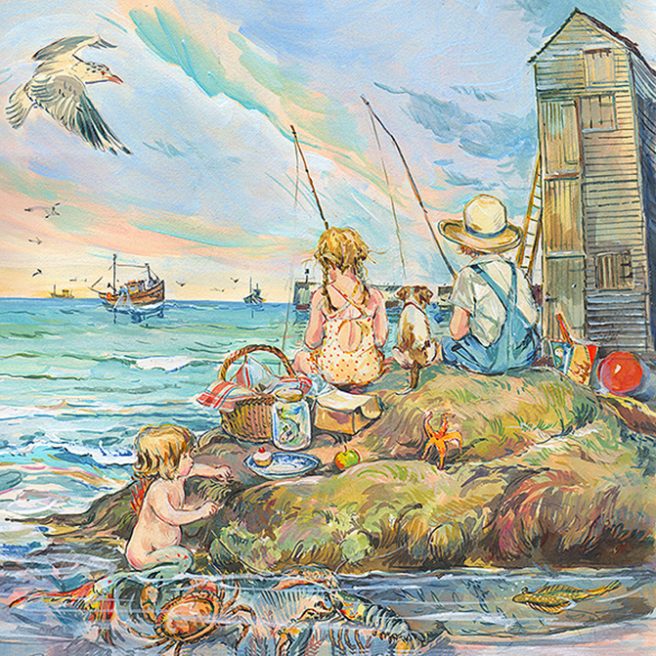 Since she lives near the sea, it’s natural that many of her paintings are set there — kids and animals enjoying themselves at the seashore, having their own adventures.