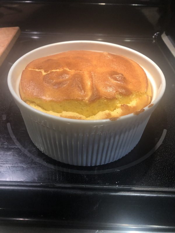 DO NOT open the oven door while cooking. Only check for doneness at the end of the hour. If the pie pan runs out of water within the cycle of cooking, open the oven door ONCE to add a little more boiling water. Around my house, we always served the soufflé with baked potatoes, peas, and a “Seizure Salad” — but that’s your call.