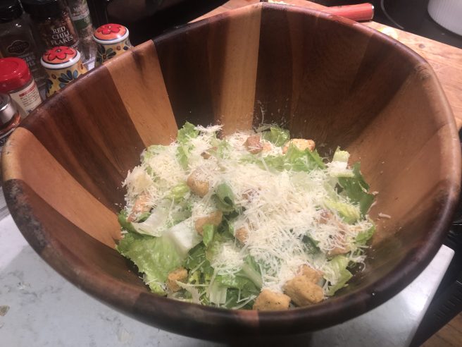 Press with fork garlic cloves that have been liberally sprinkled with salt into the sides of the wooden bowl. Add mustard, Worcestershire sauce, hot sauce, and lemon. Whisk until well combined. Add olive oil and stir vigorously. Taste for balance. Correct oil to lemon, if necessary. Add hearts of romaine that have been hand-torn into pieces (not cut!). Add croutons and Parmesan or Romano cheese. Toss well.