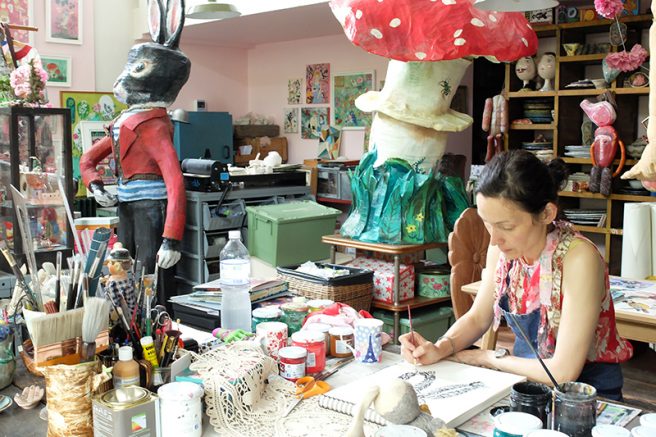How did Nathalie build a following? She began with postcards and painting shop windows. She likes the large canvas of windows and finds them easy to paint. She gradually received more commissions and over the years has collaborated with notable brands such as Gucci, Meri Meri, Chronicle Books, Vilac, Mon Petit Art, Unicom, Inka, Blue Illusion, Disneyland, and Issey Miyake.