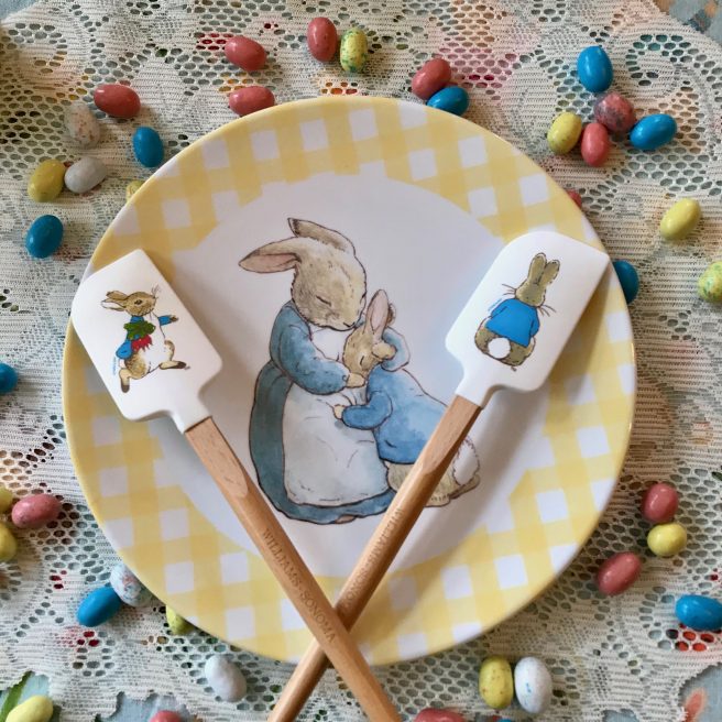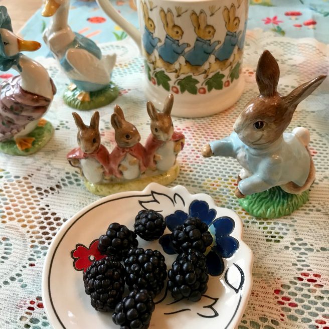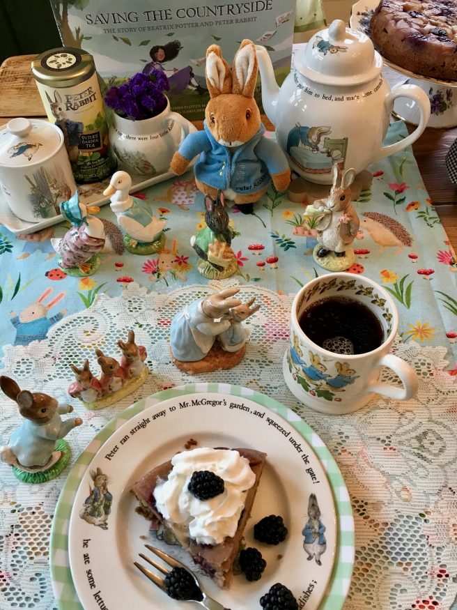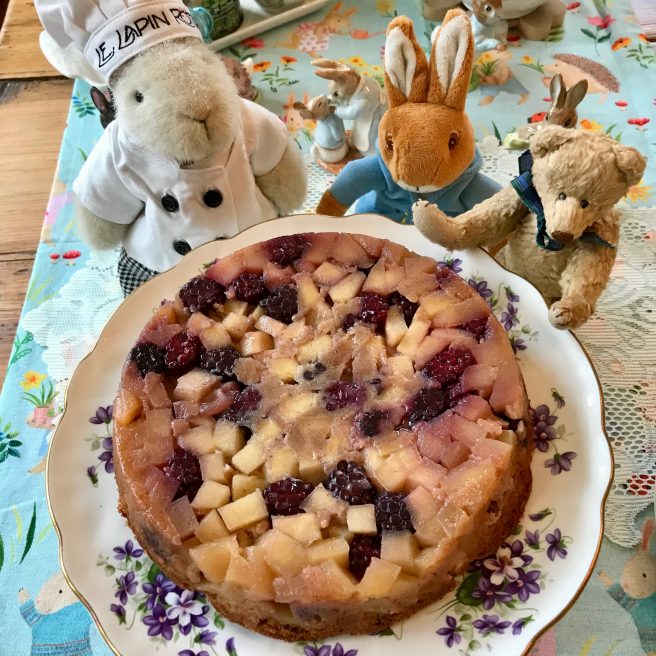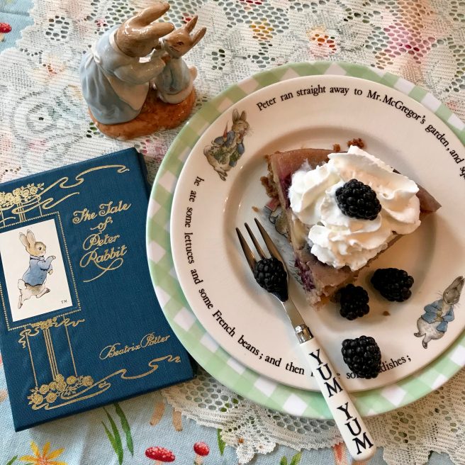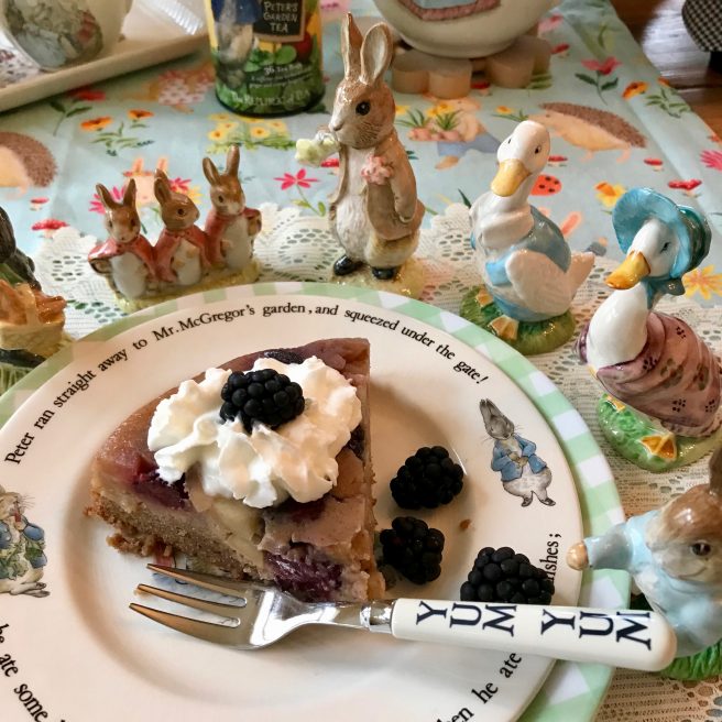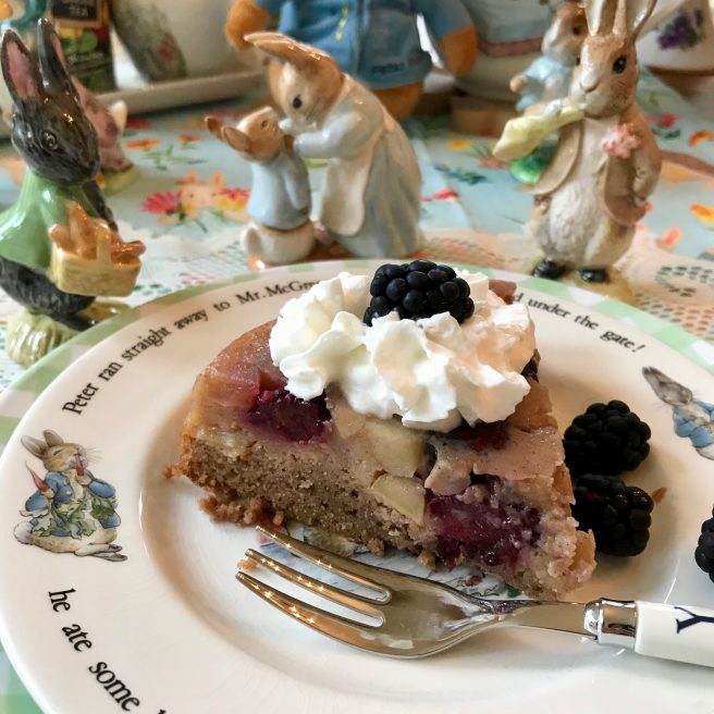 We think Beatrix would have liked this apple-y cake, and our friend Peter Rabbit (who always visits us around Easter time), was ecstatic about the blackberries, since in his story he was sent to bed without supper, and only his sisters, Flopsy, Mopsy and Cotton-tail, got to eat them.