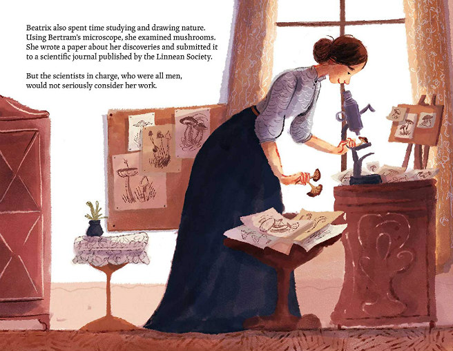 Besides art, Beatrix loved studying the natural world. She had a particular interest in mushrooms, wrote a paper about her discoveries, and submitted it to the Linnean Society. But the male scientists wouldn’t take her work seriously.