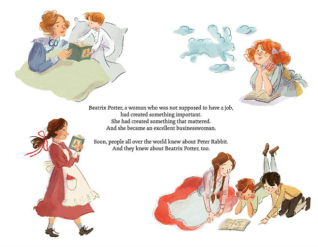 Saving the Countryside is the only Potter picture book biography I know of that offers a fuller picture of the remarkable woman behind the Peter Rabbit books. In addition to her lifelong artistic inclinations, it also shows Beatrix’s ingenuity and business savvy — holiday cards financed her self-publishing venture, and then proceeds from her traditionally published books enabled her to purchase all the Lakeland properties.