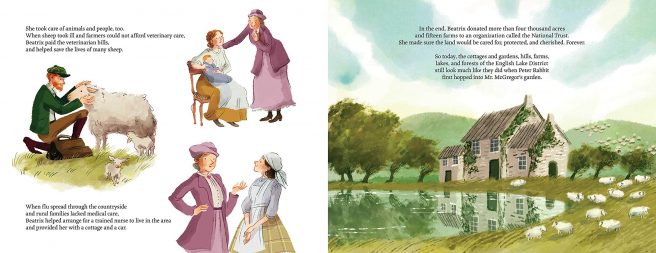 Depictions of young Beatrix as she grows into a successful author/illustrator, and eventually, a respected landowner, will appeal to the young reader, who’ll get a fair sense of her life in both city and country. They will enjoy seeing the charming animals of field and farm, and begin to better understand why she worked so hard to keep the country, country.