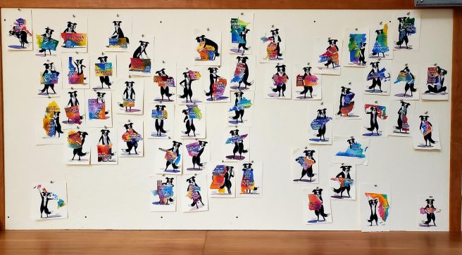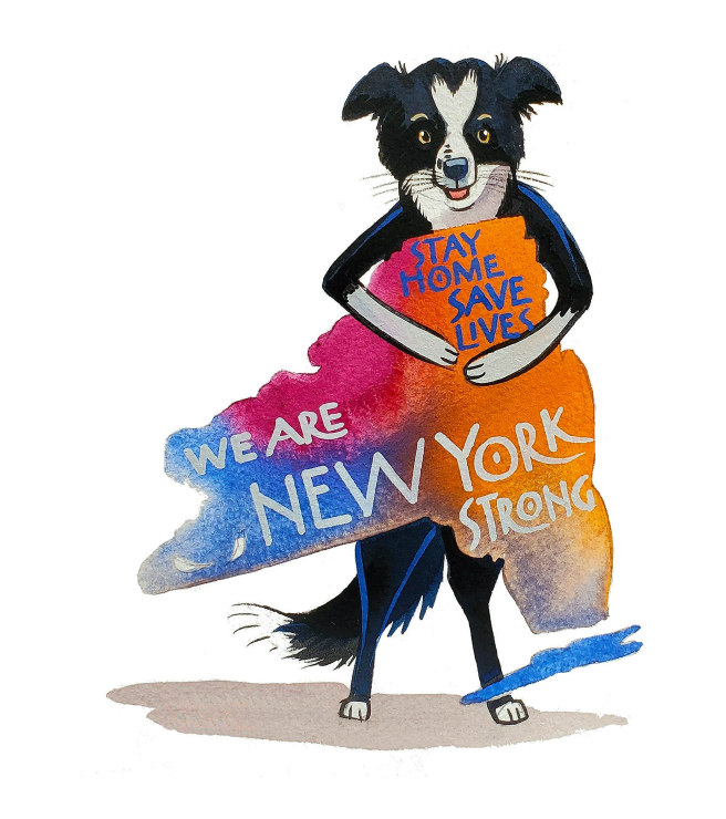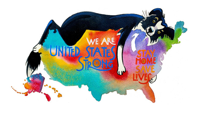 1. Uber-talented Vermont author/illustrator Ashley Wolff is featuring her border collie Rufus in a new series of “Stay Home, Save Lives” prints. She says this is her way of coping with the new reality and sharing solidarity. Pictured above is “We Are United States Strong.” Ashley also painted all 50 states and one territory.