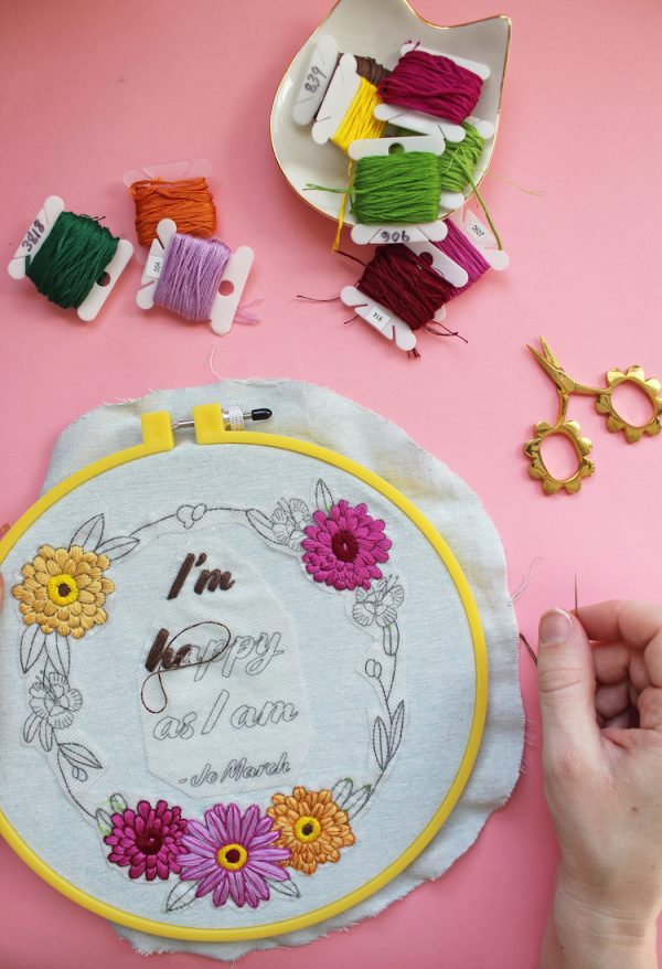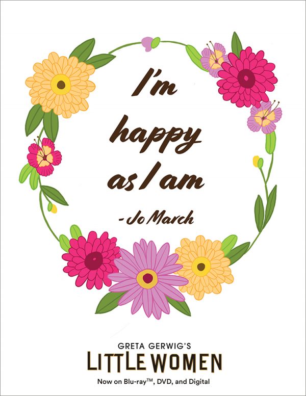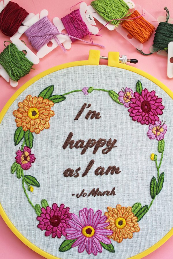8. For you crafty types who like to embroider: Sara Barnes at Brown Paper Bag has designed a cool Little Women themed pattern, featuring a quote from Jo March: “I’m happy as I am.”