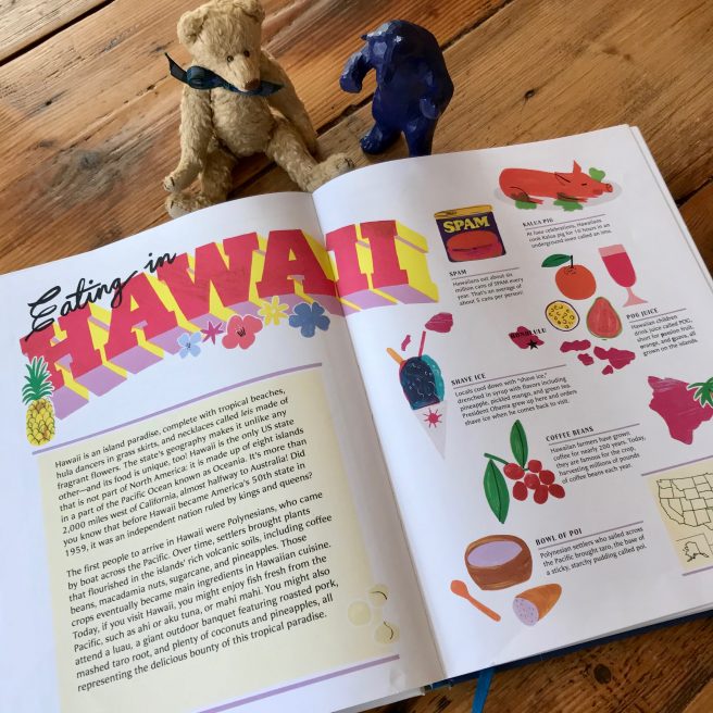 Among the tasty Hawaiian tidbits: shave ice, kalua pig, poi, and Spam (to the tune of six million cans every year). I was puzzled, though, by the recipe Langholtz featured: Tofu Poké Bowl. I know poké bowls are very popular these days, but I thought it was an odd choice for a kids’ cookbook. A traditional poké bowl would include marinated raw fish chunks served over rice. Langholtz’s kids’ version calls for marinated tofu and avocado cubes. I don’t see this as especially kid friendly, but maybe her intention was to encourage them to try something new (and it’s a good vegetarian option).